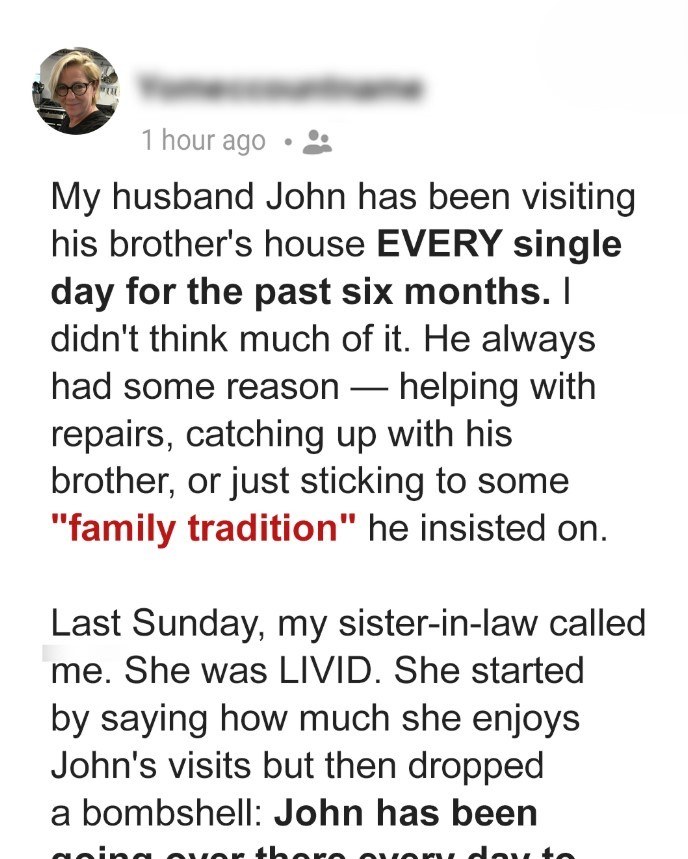 Jeanne believed she had a happy, stable marriage, but John’s unexplained visits to his brother’s house made her uneasy. One Sunday, a phone call from her sister-in-law revealed a shocking secret that turned Jeanne’s world upside down, setting the stage for a confrontation she never anticipated. So, I’ve been in a bit of a daze since Sunday and I need to vent.
