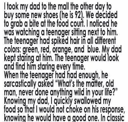 Now, if I were there, I’d probably choke on my soda from laughing so hard. But the best part of this story is what the dad said in response. Knowing his character—the kind of no-nonsense, quick-witted old-timer that’s always ready with a good comeback—the person who told this story said they quickly swallowed their food to avoid choking on their own laughter because they knew what kind of response the dad was about to give. And sure enough, without missing a beat, the dad looked right at the kid with a straight face and delivered one of the most hilarious, unexpected comebacks I’ve ever heard.