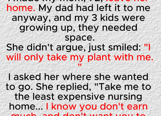 The day she left, she walked out slowly, carrying nothing but a small, worn bag and that green potted plant she’d watered every morning for years. I didn’t help her to the car. I told myself she was strong enough. I told myself I’d visit soon.